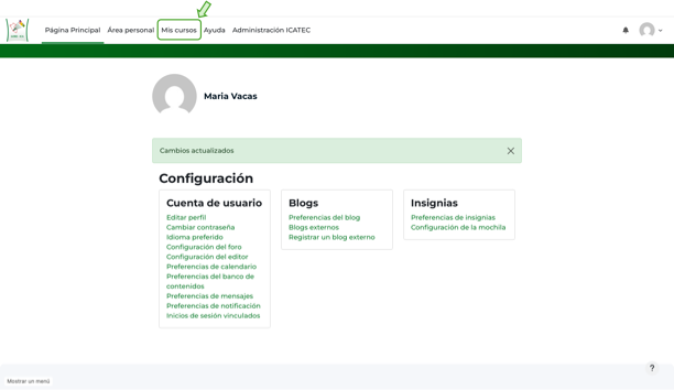 Una vez que ha rellenado sus datos y está en la página de configuración del usuario, puede utilizar el menu superior para navegar al resto de la plataforma, si por ejemplo pulsa en "Mis Cursos" podra acceder al area de bienvenida, al test de competencias digitales y a los cursos en los que este matriculado.