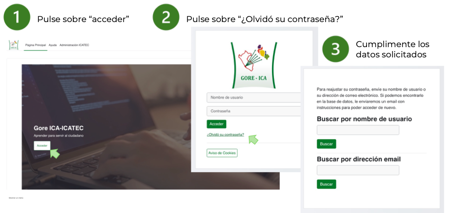 En la pantalla de inicio de sesión (https://elearning.icatec.pe), haga clic en “¿Olvidó su nombre de usuario o contraseña?”. Ingrese su correo electrónico registrado y recibirá un mensaje con las instrucciones para restablecer su contraseña.